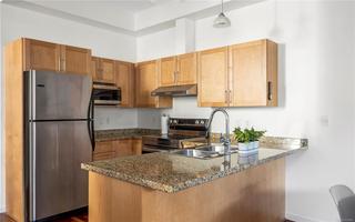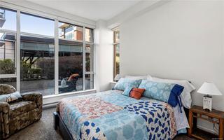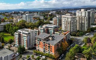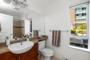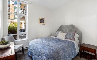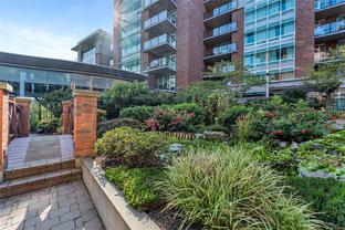 Discover a rare blend of space, light, and tranquillity in Victoria’s sought-after Humboldt Valley, steps from Beacon Hill Park, Cook St Village, and the Inner Harbour. This ground-level residence feels like a private townhome, with soaring 9’9” ceilings, an open layout, and seamless flow to the outdoors. The highlight is a 23'7" x 8'6” south-facing patio opening to landscaped courtyard gardens - an inviting retreat for morning coffee, entertaining, or quiet relaxation. Inside, the two-bedroom, two-bath design is bright and functional, with floor-to-ceiling windows in the primary suite, a modern kitchen, an open den, and ample storage. True one-level living with zero steps makes it perfect for those downsizing without compromise. Located in City Place, an award-winning steel and concrete building with secure parking (EV charger), bike storage, storage locker, pet-friendly policies, and rentals permitted. A garden sanctuary paired with the quality and security of concrete construction.