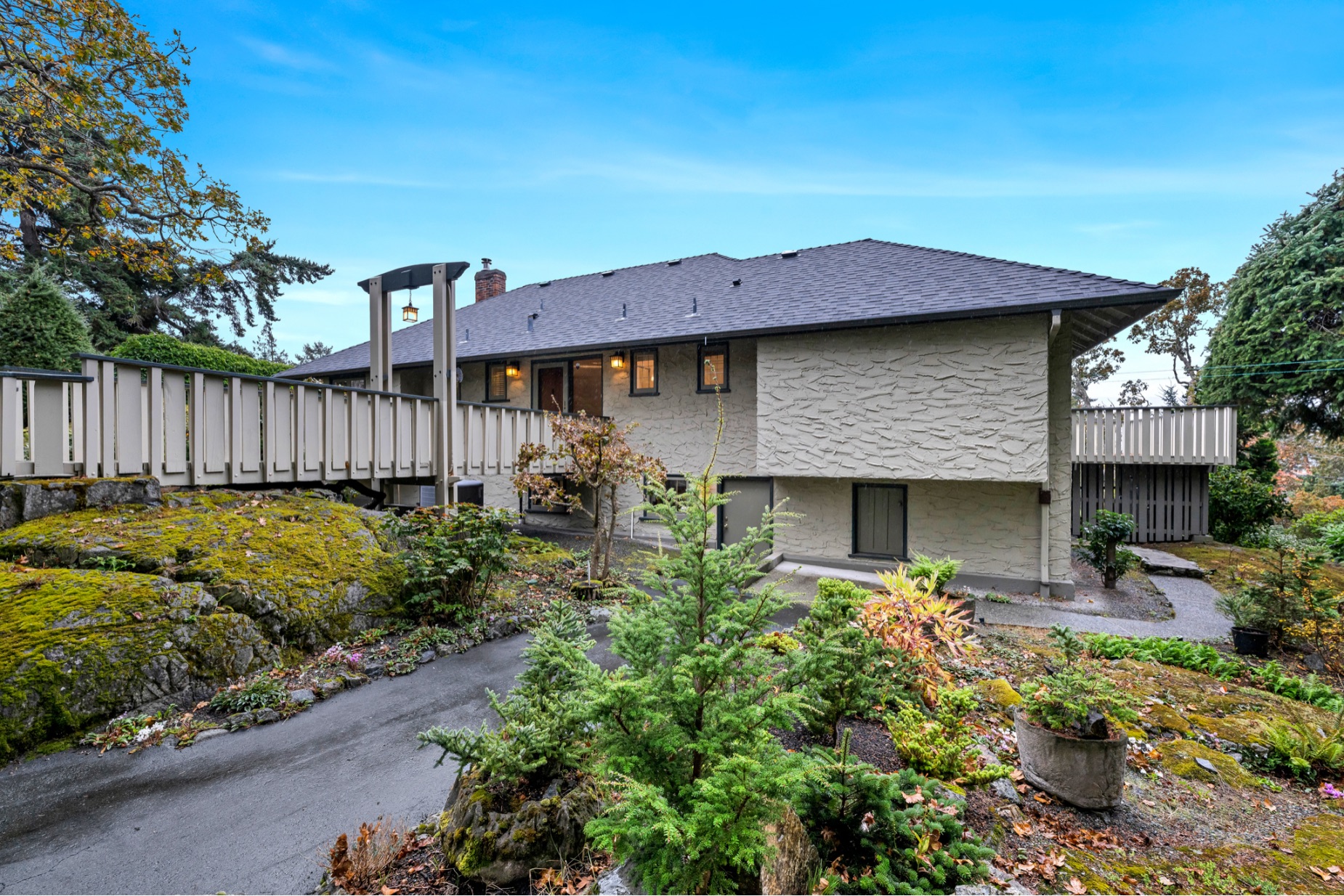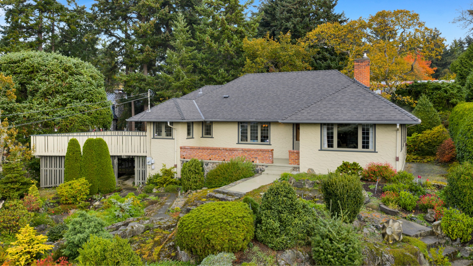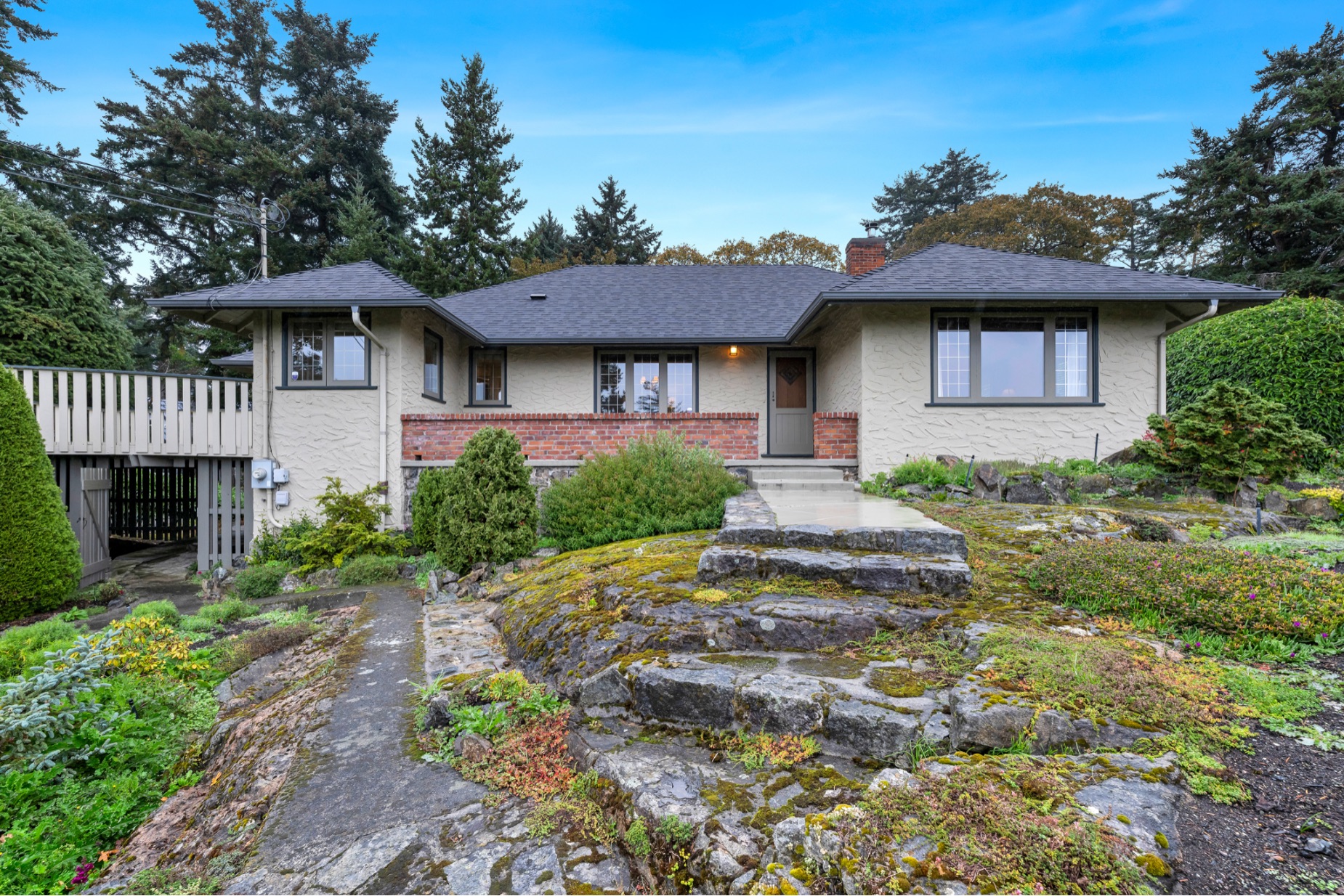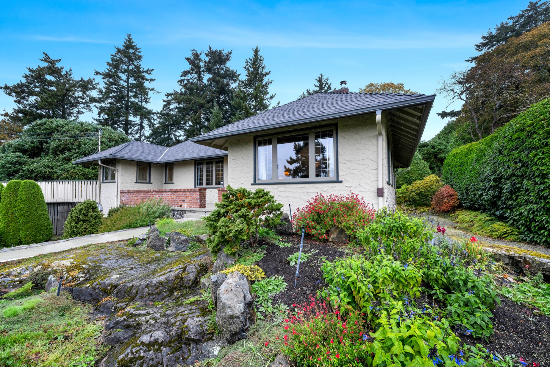 Welcome to your private sanctuary in Ten Mile Point, one of Victoria's most lovable seaside neighbourhoods. Set on nearly three-quarters of an acre of beautifully landscaped and fully fenced gardens, this meticulously cared-for home offers tranquility, spectacular views, and timeless charm. Inside, over 1,500 sq ft of thoughtfully designed living space features two bedrooms and two bathrooms, all on one level. The updated kitchen leads to a fantastic office space, and a large deck overlooking the gardens and water. The dining and living areas offer light and character, while being surrounded in nature. Every detail reflects pride of ownership and careful maintenance throughout. The unfinished basement offers ample storage and a versatile workshop space. Enjoy the best of both worlds - the privacy and natural beauty of Ten Mile Point, with convenient access to Cadboro Bay Village, walking trails, and the ocean just steps from your door. A truly special home in an exceptional setting.