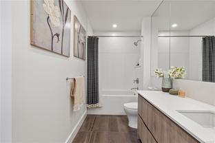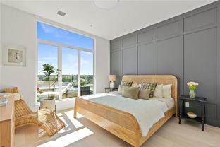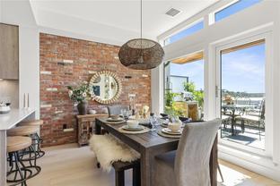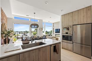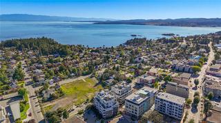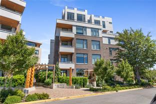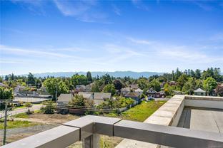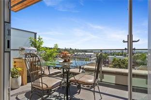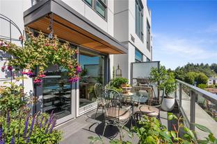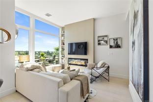 Sub Penthouse in Esquimalt Town Square! A charming and vibrant community offering the perfect blend of modern living and walkable amenities. This 1 bedroom plus den, luxury condo, offers oversized picture windows with mountain, city and ocean views from the 217 sq ft balcony! 9'7" ceilings, reclaimed brick feature wall, and modern electric fireplace. Oak flooring and Oak shelving in living room, closets and den/office. Bosch oven, gas range (gas included in strata fee), Fisher Paykel fridge, and custom cabinetry. Spacious bath with soaker tub and geothermal heated flooring. Gas BBQ hookup. Secure underground parking spot with EV charger. Live right beside the public library, ERC coffee, Saxe Point Pub, Esquimalt Rec Center with lap lanes, sauna, hot tub & steam room, 2 grocery stores within 5 minutes & Saxe Point just a walk away. Exceptionally maintained building! Low strata fees. Call your Realtor now to book your viewing!