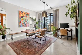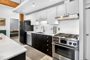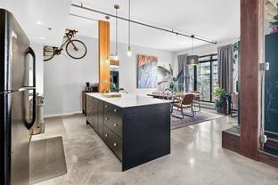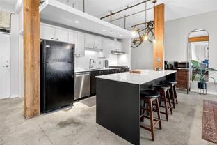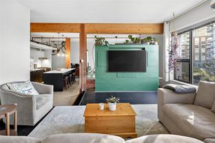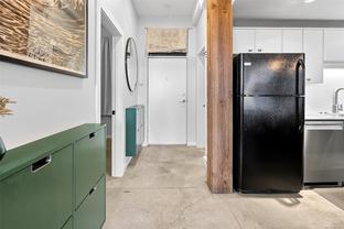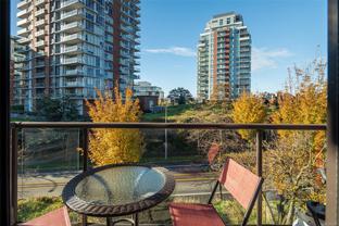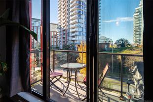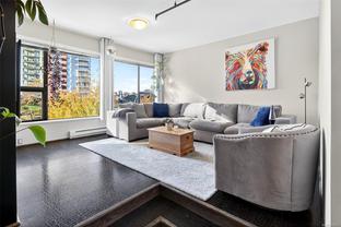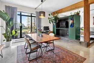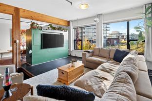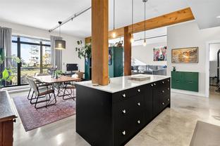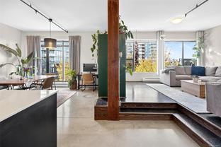 Welcome to The Edge in Vic West, a coveted steel & concrete building offering urban loft living. This bold 1BD, 1BA condo offers 995 sqft of functional space with 10' ceilings, polished concrete floors, exposed fir posts, and expansive windows that fill the space with natural light. The open-concept layout flows from the upgraded kitchen into the dining area and raised living room, creating a unique and versatile space. The enclosed bedroom includes a custom closet system, while the SW-facing deck provides city vistas toward the Inner Harbour. Recent 2024 updates include quartz kitchen counters/backsplash, Fisher & Paykel gas range, refreshed cabinetry, new lighting, and resealed concrete floors. Pets (2 dogs or 2 cats) are welcome with no size restrictions, plus BBQs are permitted on balconies. In-suite laundry, secure EV-ready parking, and unrestricted street parking on Sitkum complete this exceptional offering, just steps to the Songhees walkway and all amenities in Downtown Victoria.
